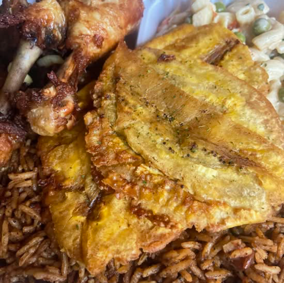 Griot et poulet aux épices Shandmas, riz collé, macaroni, pikliz. / Half griot, half chicken with Haitian spices.